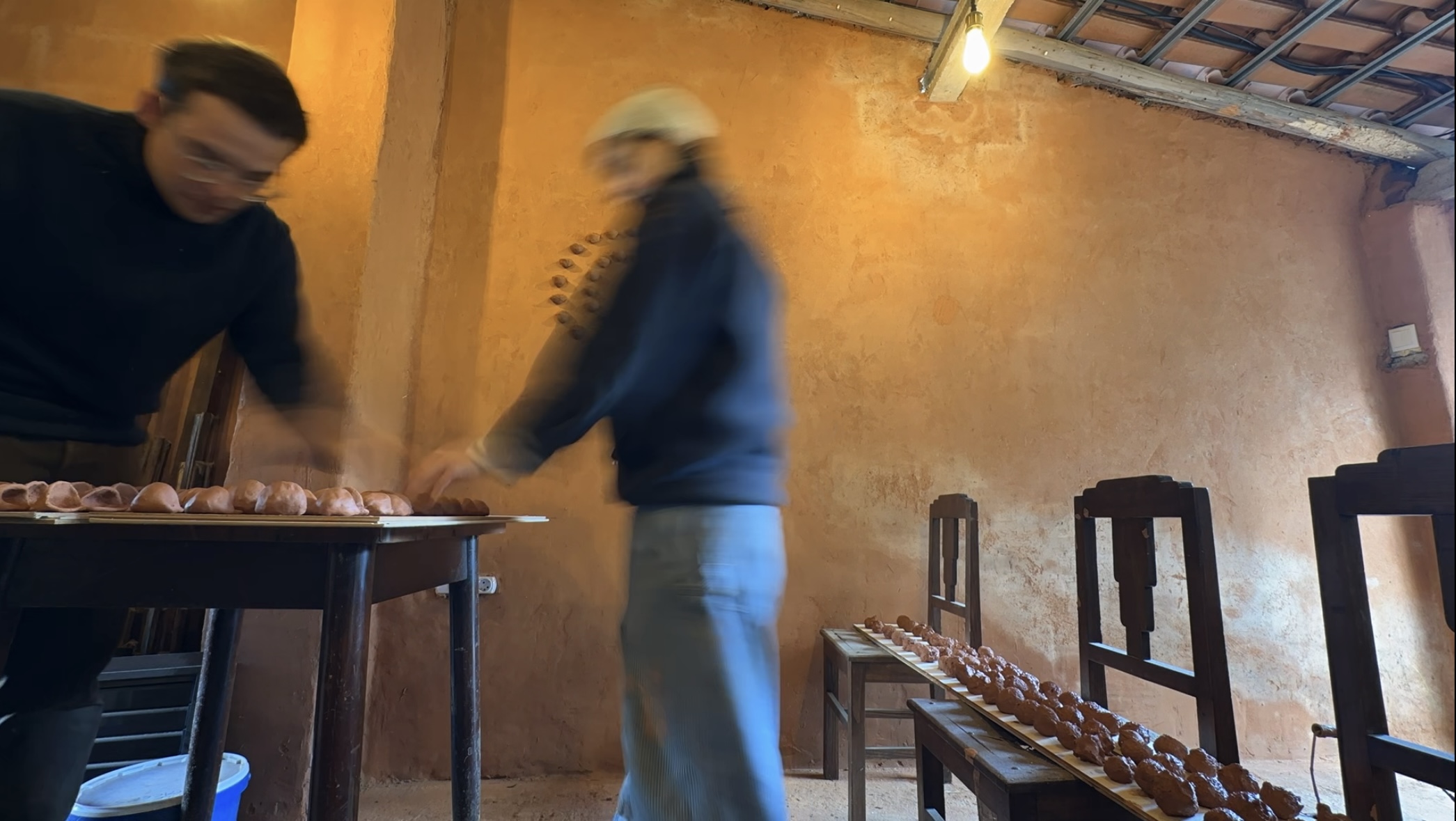 Using locally dug terracotta clay, a spiral walnut shelf